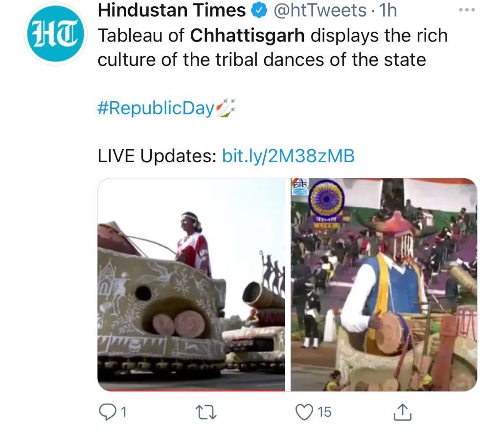 नेशनल मीडिया टाइम्स नाउ ने अपने ट्विटर हेण्डल में इसकी सराहना करते हुए लिखा है कि भारत की सांस्कृतिक विविधता आज पूरे वैभव के साथ राजपथ पर दिखी। हिन्दुस्तान टाईम्स ने लिखा कि झांकी में छत्तीसगढ़ की समृद्ध आदिवासी नृत्य और संगीत परम्परा को प्रदर्शित किया गया। फाइनंेशियल एक्सप्रेस ने अपने ट्विटर हेण्डल में लिखा कि छत्तीसगढ़ राज्य की झांकी में संगीत के विविध वाद्य यंत्रों को बहुत खूबसूरती से प्रदर्शित किया गया है।