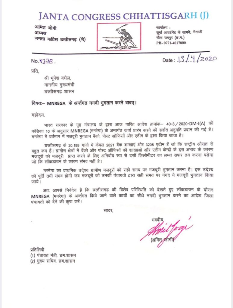 जोगी ने कहा मरनेगा का प्राथमिक उदे्श्य ग्रामीण मजदूरों को सही समय पर मजदूरी भुगतान करना है। इस उदे्श्य की पूर्ति तभी संभव होगी जब मजदूरो को उनकी पंचायतो द्वारा सही समय पर नगद मे मजदूरी भुगतान किया जायेजोगी ने छत्तीसगढ़ की विशेष परिस्थिति को देखते हुए लाॅकडाउन के दौरान मनरेगा के अंतर्गत किये जाने वाले कार्यो का सीधे नगदी भुगतान करने का आदेश जिला पंचायतो को देने का आग्रह मुख्यमंत्री भूपेश बघेल जी से किया है ।